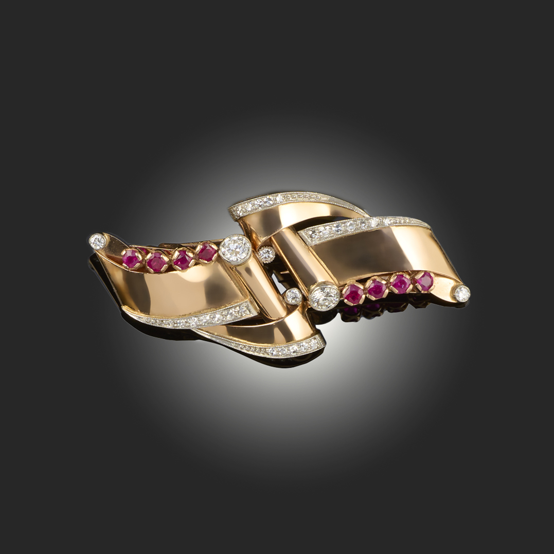 A RUBY AND DIAMOND DOUBLE CLIP BROOCH, C1940