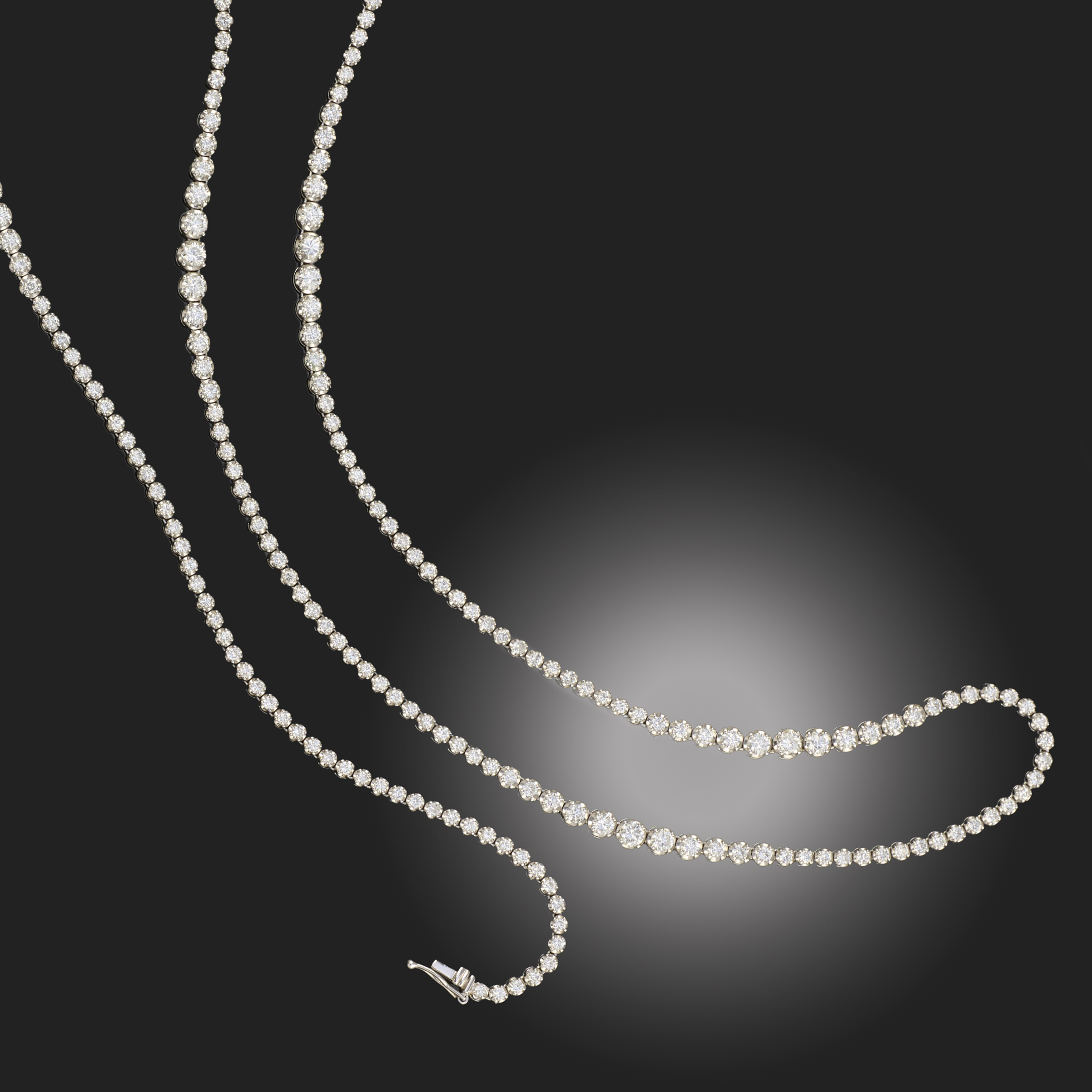 A LONG DIAMOND NECKLACE, set with round brilliant cut diamonds which graduate to larger and smaller stones, in white gold, stamped 750, total approximate diamond weight 9.00cts, length 81cm