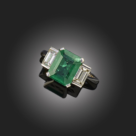 AN EMERALD AND DIAMOND THREE STONE RING, set with an emerald-cut emerald between two emerald-cut diamonds, in 18ct white gold, maker's mark G&P, with Birmingham hallmarks for 1996, size K 1/2