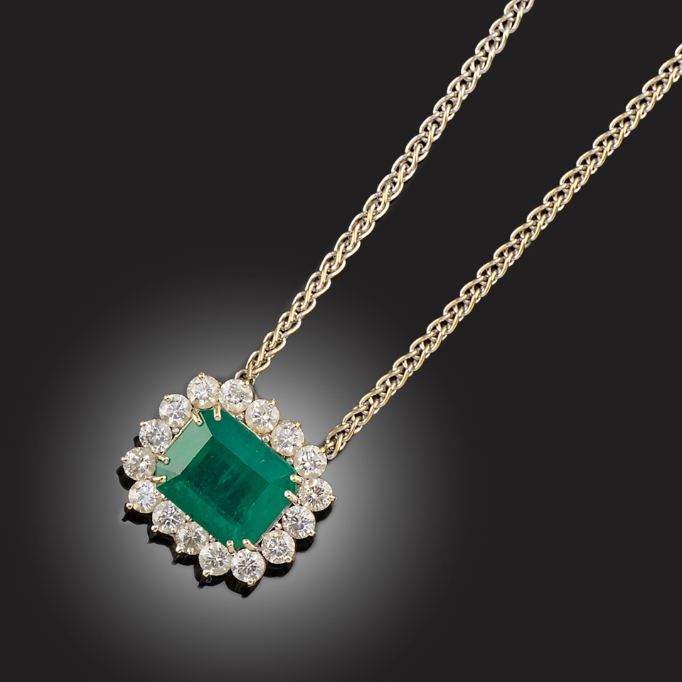 AN EMERALD AND DIAMOND CLUSTER PENDANT NECKLACE