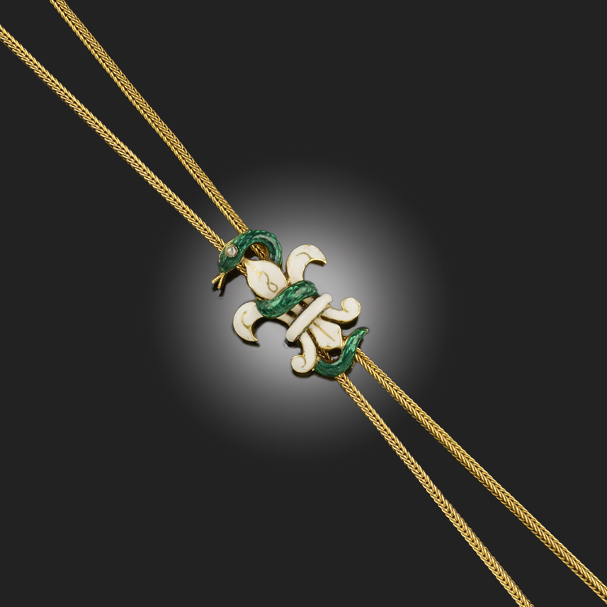 A 19TH CENTURY GOLD LONG CHAIN, of twisted rope linking and joined with an enamel slide depicting a snake wrapped around a fleur-de-lys in green and white enamel with a rose-cut diamond eye, chain length 120cm, slide length 2cm