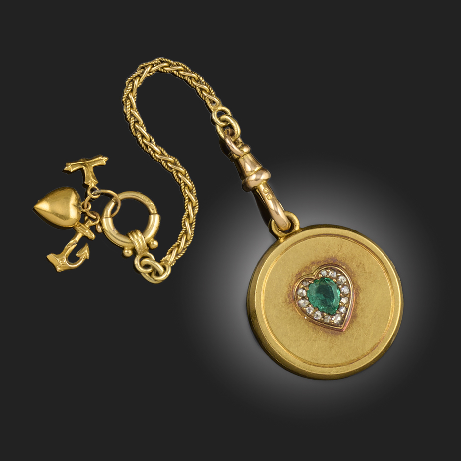 A LATE 19TH CENTURY GOLD LOCKET, decorated with a heart set with a pear-shaped emerald within a border of rose-cut diamonds, opening to reveal a lock of hair, on a loop-in-loop chain, inscribed Glaube, Liebe, Hoffnung and den 24ten. Juli 1863, partial Austrian maker’s and assay marks, locket width 2.5cm, chain length 10cm