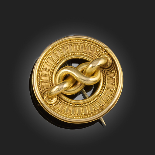 ERNESTO PIERROT, LATE 19th CENTURY, A CIRCULAR GOLD BROOCH, decorated with a central gold knot motif within circular border with pellet work and ropetwist decoration, length 2.5cm
