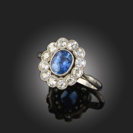 A SAPPHIRE AND DIAMOND CLUSTER RING