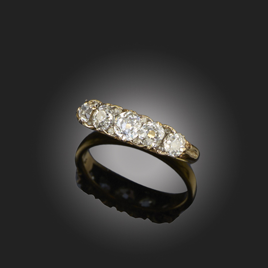 A LATE 19TH CENTURY DIAMOND HALF-HOOP RING, set with five graduated old circular-cut diamonds, to a yellow gold mount accented with diamond pointers, size R