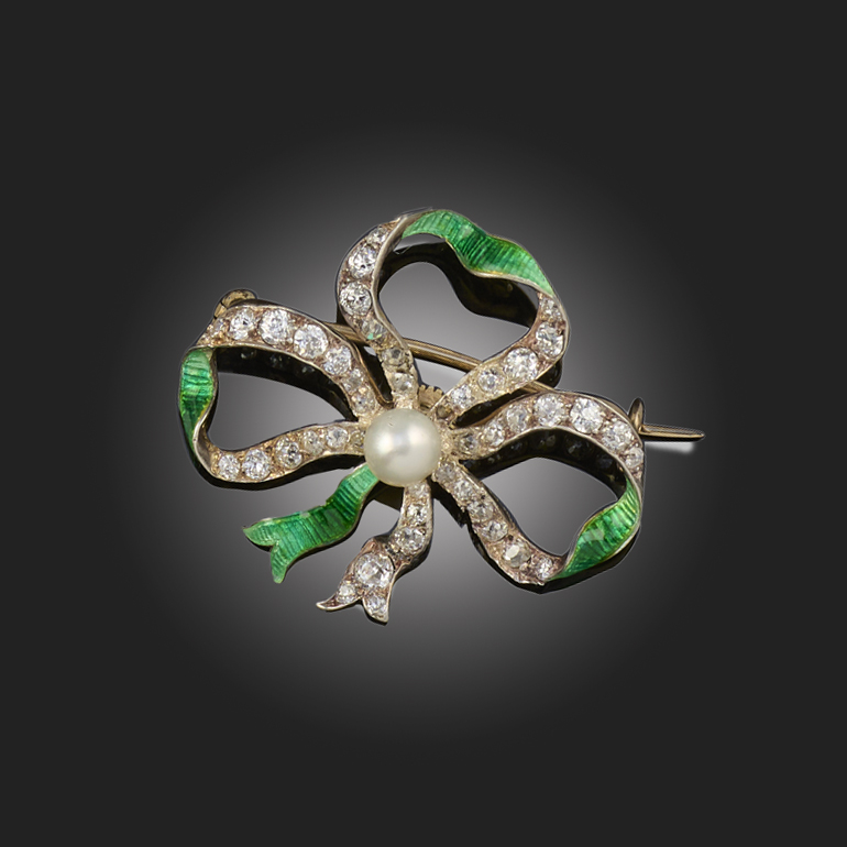 A LATE 19TH CENTURY ENAMEL AND DIAMOND BOW BROOCH / PENDANT, alternately decorated with green enamel and old cut diamonds (one missing) in silver and gold, centring on a pearl, pearl untested, detachable brooch fitting, width 3.6cm