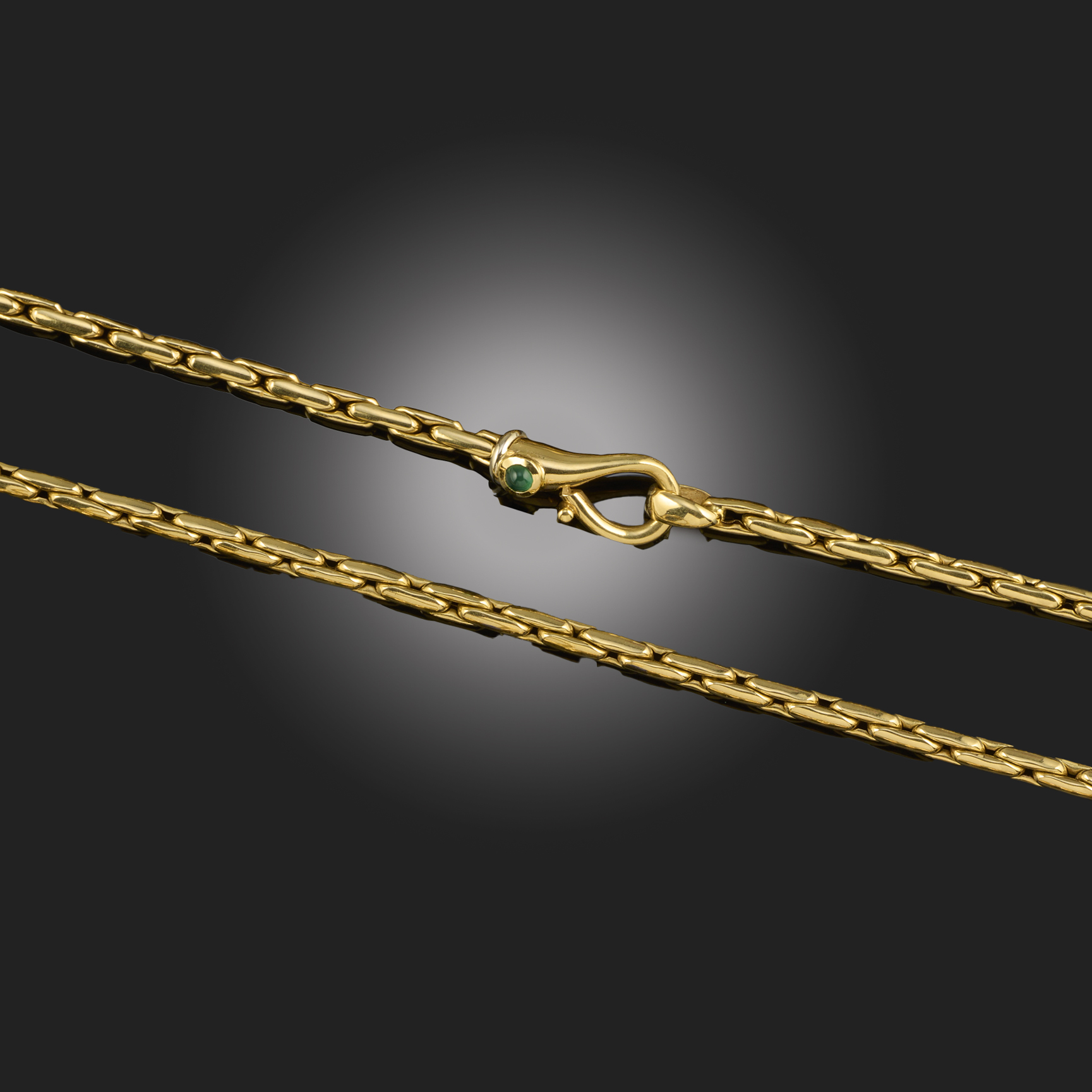 A GOLD AND CHALCEDONY NECKLACE, of chunky paperclip linking, set with a chalcedony cabochon to the clasp, in yellow gold, stamped 750 with Italian control marks, length 76cm, gross weight 44.5g