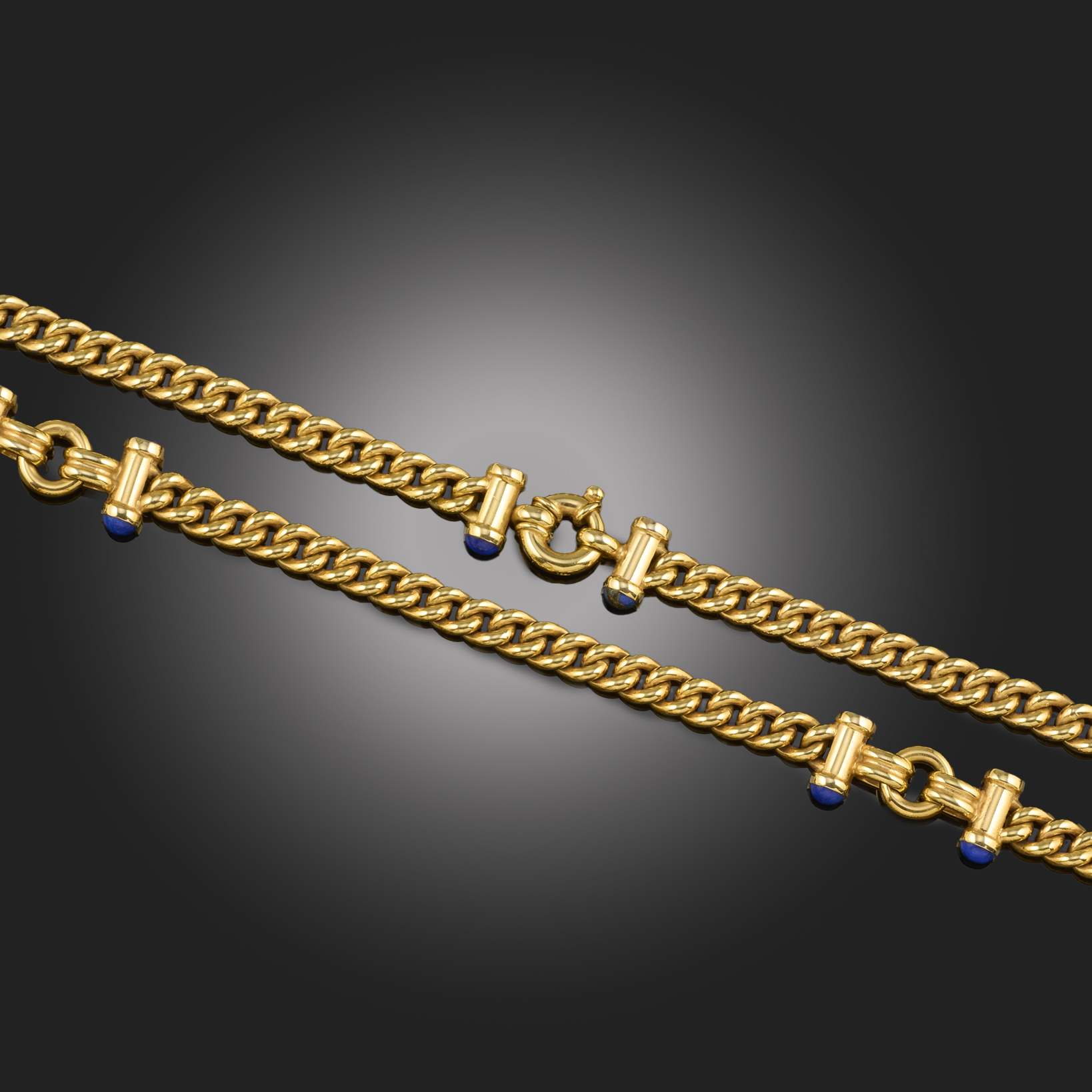 A CURB-LINK GOLD NECKLACE, separated with T-bar links accented with lapis lazuli in yellow gold, length 44cm, 28.5g