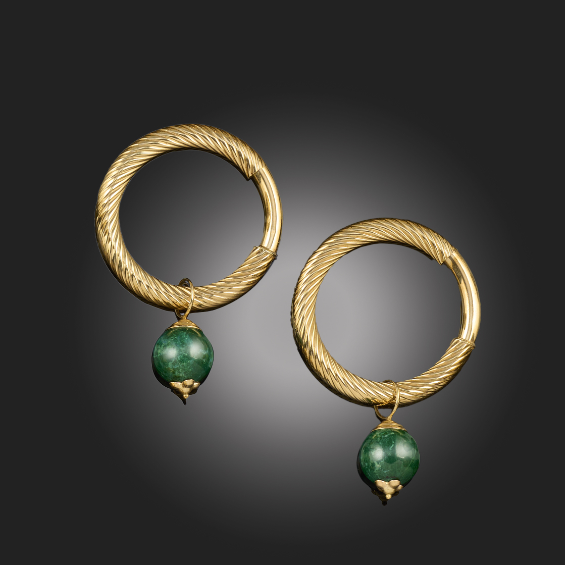 A PAIR OF GOLD HOOP EARRINGS, each of rope-twist hoop design suspending a gold-mounted green stone bead drop, length 4.8cm, clip fittings, weight of hoops without beads 3.4g