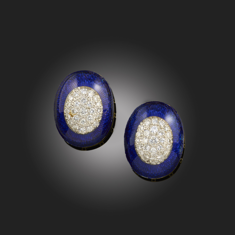 A PAIR OF BLUE ENAMEL AND DIAMOND CLUSTER EARRINGS, of oval design centring on a cluster of round brilliant-cut diamonds within blue guilloché enamel border in 18ct gold, post and clip fittings, length 2.2cm