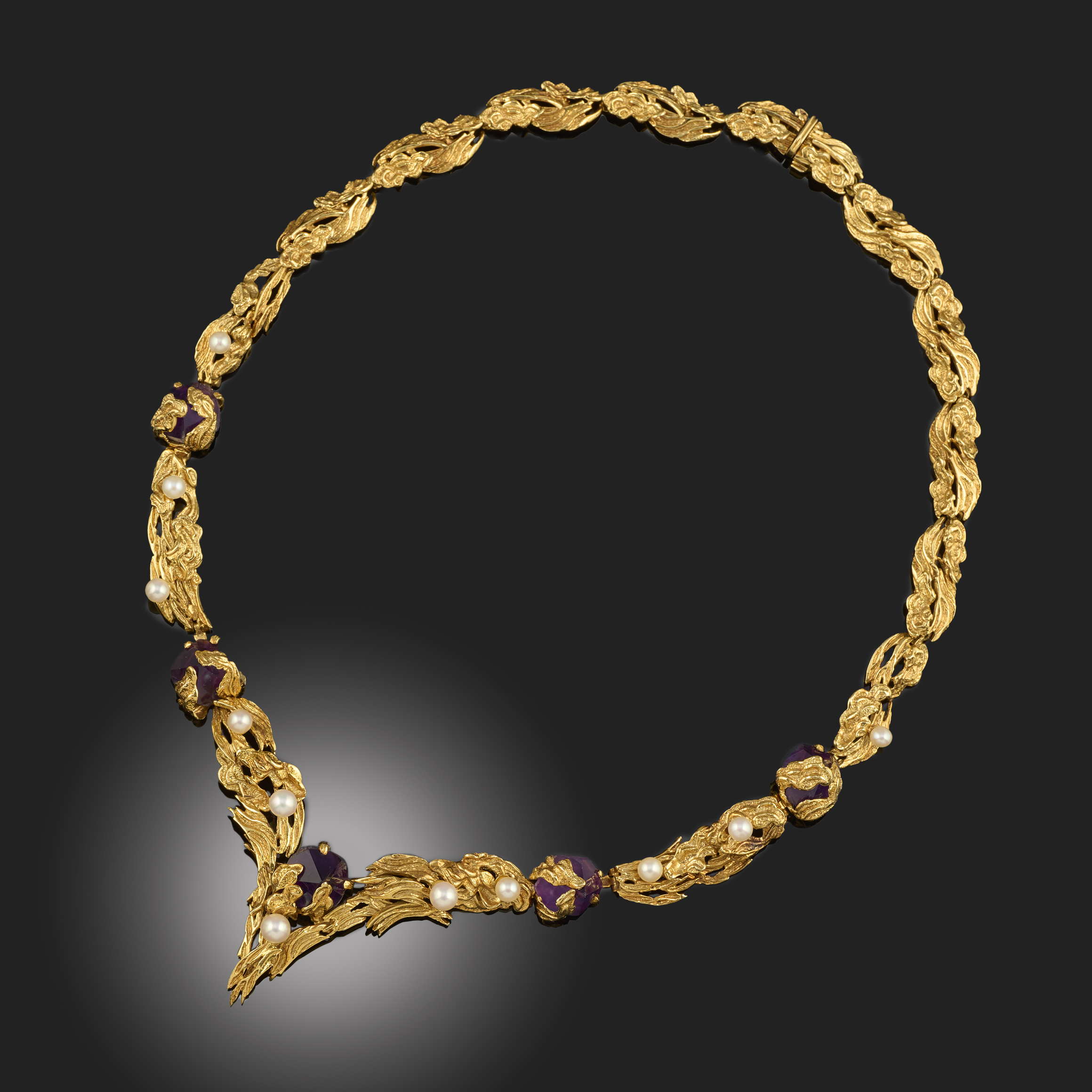 GROSSE, AN AMETHYST, CULTURED PEARL AND 18CT GOLD NECKLACE, C1965, of wishbone design composed of textured 18ct gold scrolling links set with faceted amethyst crystals and cultured pearls, signed Grosse, Germany 65, London import marks for 1967, length 42cm, gross weight 56.1g, case