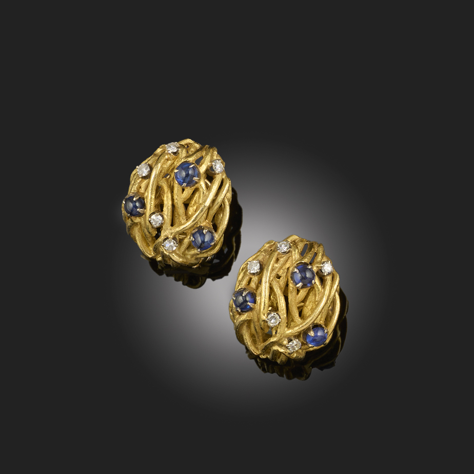 A PAIR OF SAPPHIRE AND DIAMOND CLUSTER EARRINGS, 1970s, set with cabochon sapphires and round brilliant-cut diamonds in textured woven strands of 18ct yellow gold, post and clip fittings, length 2cm