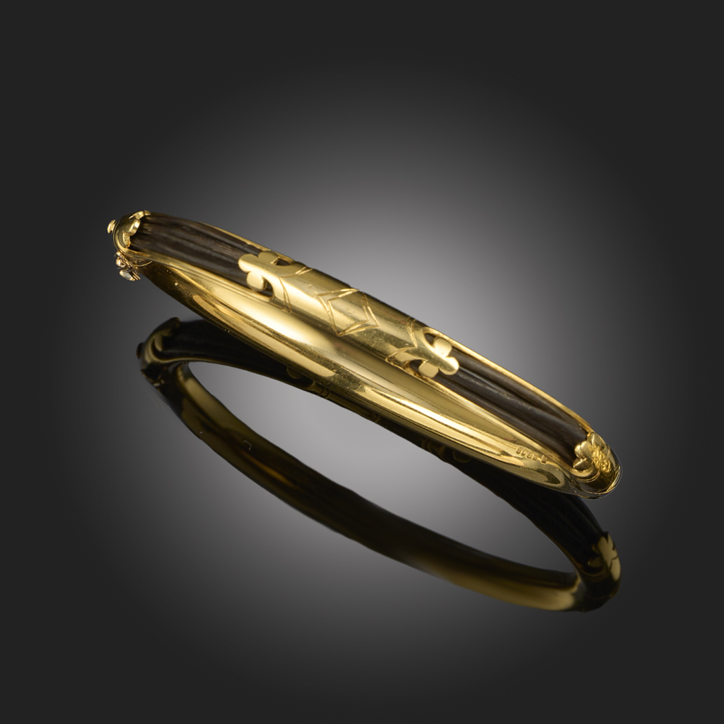 λ CARTIER, A GOLD-MOUNTED HINGED BANGLE, C1974, composed of rows of elephant's hair within engraved 18ct yellow gold mounts, signed Cartier London, maker's mark JC, London hallmarks for 1974, inner circumference approximately 16cm