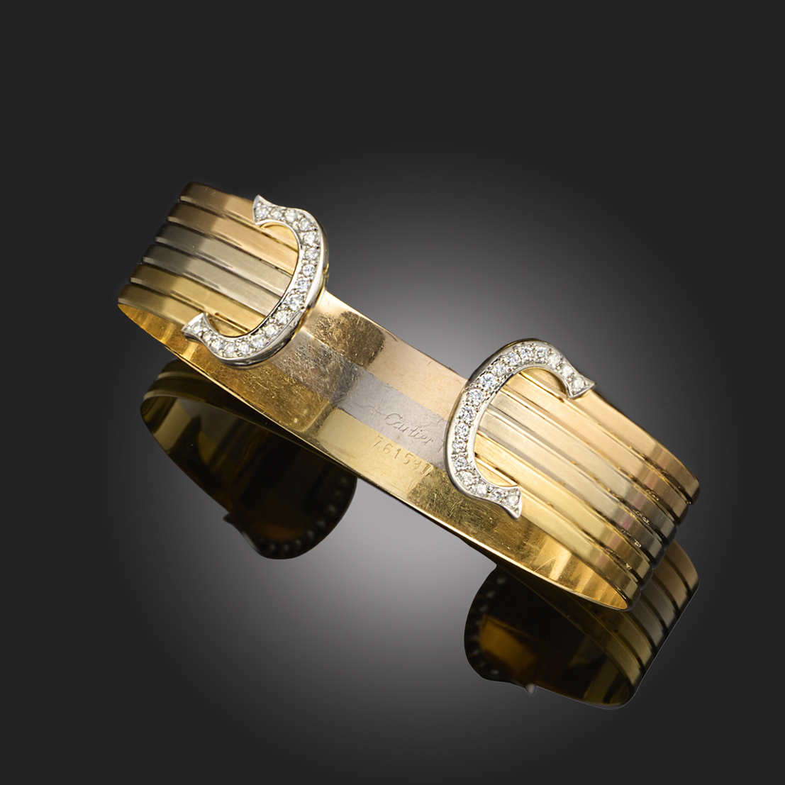 CARTIER, A 'C DE CARTIER' DIAMOND-SET CUFF BANGLE, the 'C' motifs set with round brilliant-cut diamonds, to the terminals of the tri-colour gold bangle, signed Cartier, stamped 750, with Swiss control marks, numbered 761597, inner circumference approximately 19cm