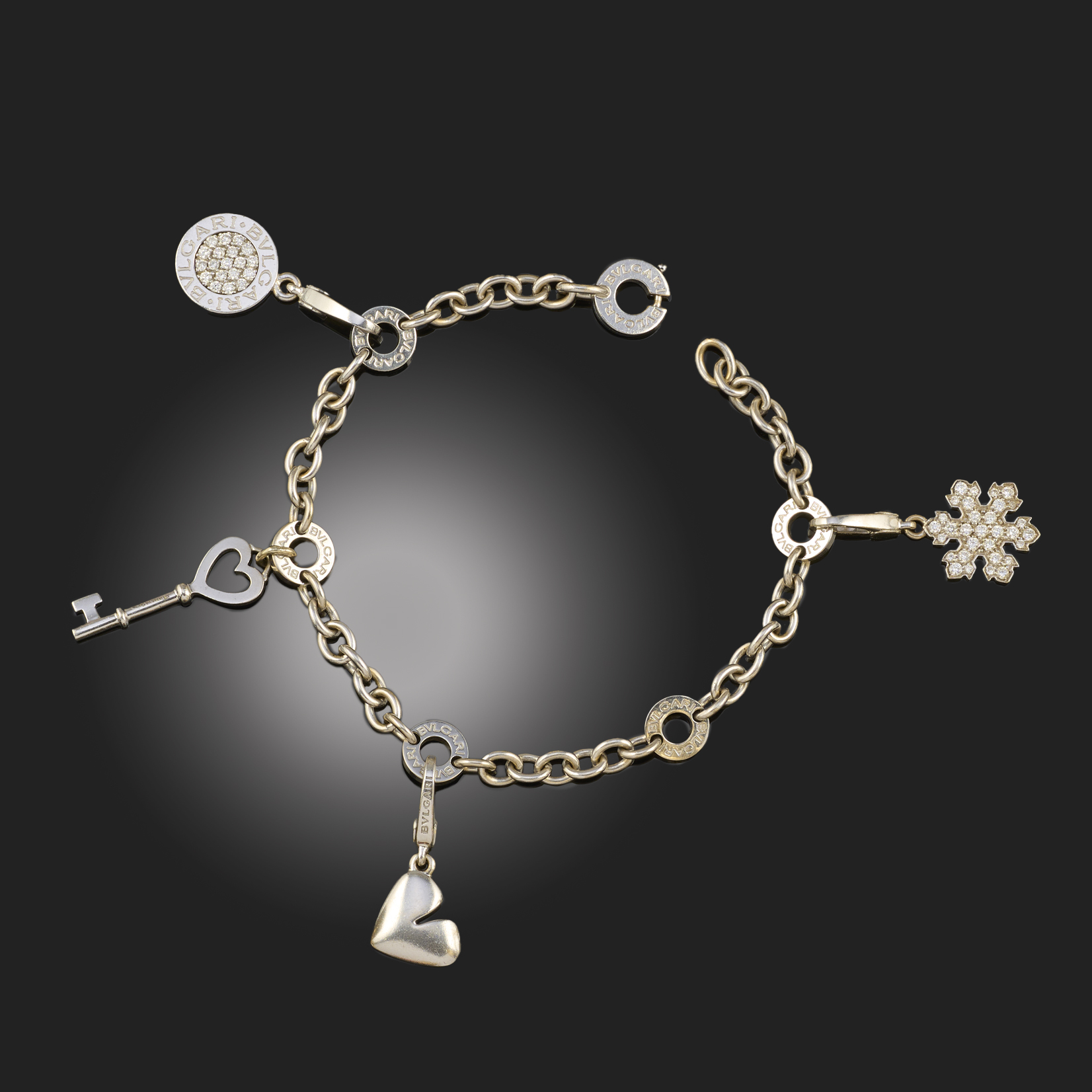 BULGARI A GOLD CHARM BRACELET, suspending three Bulgari charms and key-shaped charm by Tiffany & Co, the bracelet signed Bulgari and Made In Italy, length 19cm, 25.5g