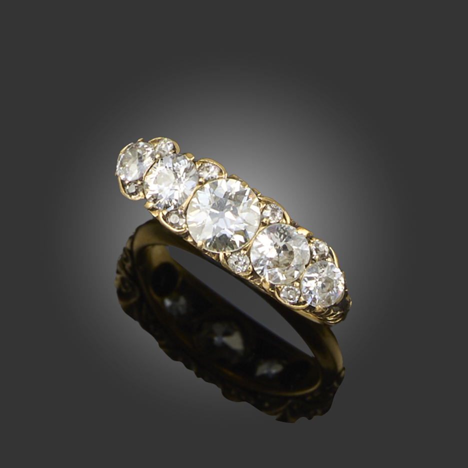 A DIAMOND FIVE STONE RING, C1898, set with graduated old circular-cut diamonds accented with diamond pointers in carved and pierced 18ct yellow gold setting, Birmingham hallmarks for 1898, size N, case