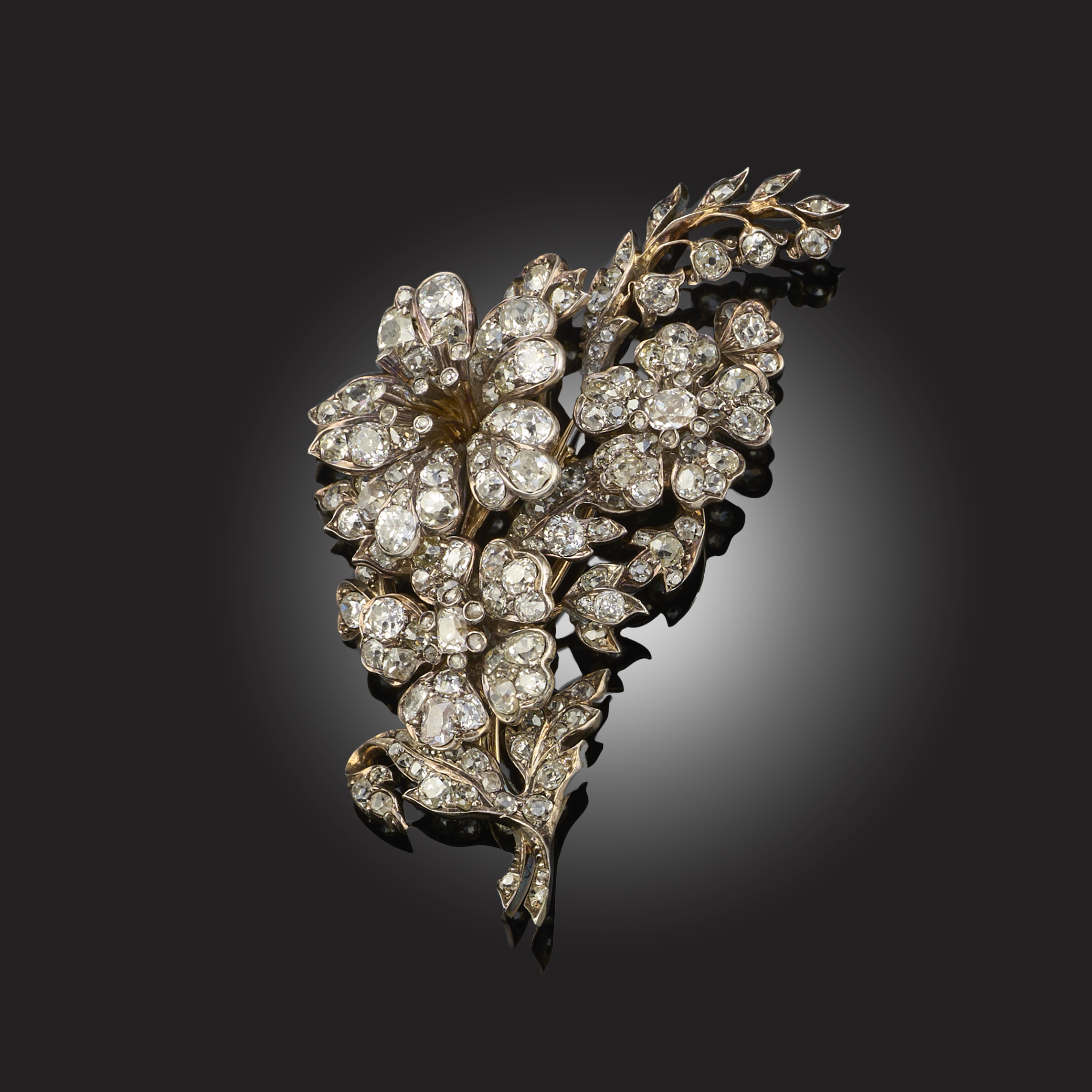 A VICTORIAN DIAMOND BROOCH, designed as a floral spray, set with old cushion-cut and rose-cut diamonds, mounted in silver and gold, length 6.5cm