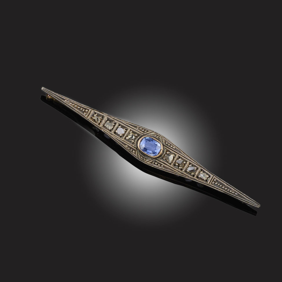A SAPPHIRE AND DIAMOND BROOCH, set with a cushion-shaped sapphire weighing 0.77cts within a diamond surround in silver and gold, length 7.1cm