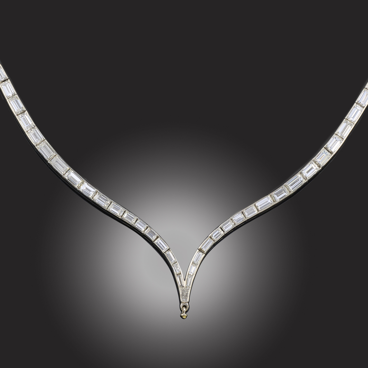 A DIAMOND-SET COLLAR NECKLACE, channel-set with graduated baguette-shaped diamonds in platinum, terminating in a vacant pendant loop for suspension, total approximate diamond weight 25.00cts, length 40cm