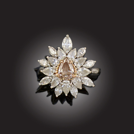 A DIAMOND CLUSTER RING, set with a central pear-shaped brown diamond within a surround of pear-shaped and marquise-shaped diamonds in white gold, stamped 18k, size M