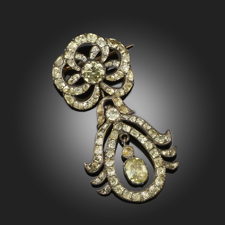 A CHRYSOBERYL BROOCH, CONVERTED, POSSIBLY PORTUGAL, 18TH CENTURY, originally designed as an earring, the surmount centred with a circular-cut chrysoberyl within a chrysoberyl-set ribbon-tie border, suspending a chrysoberyl-set scrolling drop-shaped pendant centred with a cushion-shaped chrysoberyl, mounted in silver, length 4.8, later brooch fitting