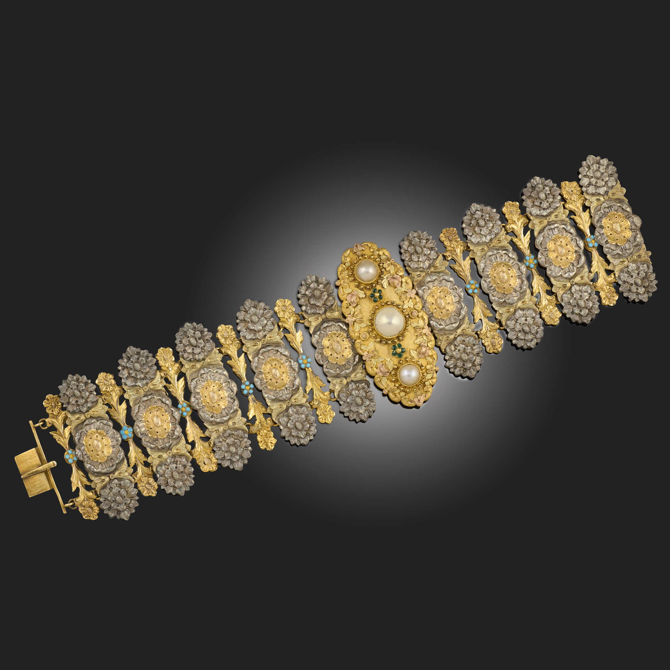 AN EARLY 19TH CENTURY MABÉ PEARL AND ENAMEL BRACELET, the central oval link in tri-colour gold set with three graduated mabé pearls alternating with two green enamel flowerheads within a scrolling floral border, to a strap composed of oblong links in silver and gold carved as floral motifs, alternating with slender gold links carved as floral stems and centred with blue and yellow enamel flowerheads, length 17.5cm, cased