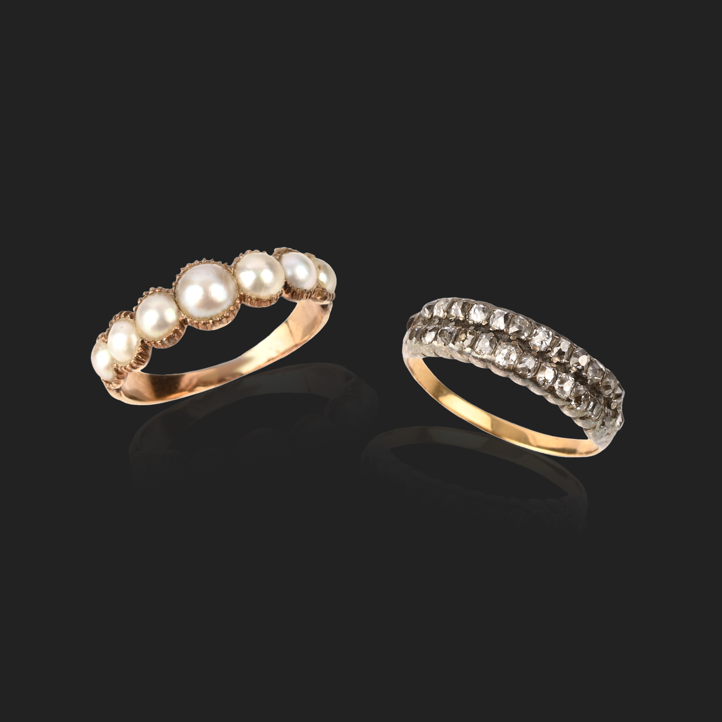 TWO EARLY 19TH CENTURY RINGS, comprising: a diamond half-hoop ring, composed of two rows of cushion-shaped diamonds, mounted in silver and gold, size Q; and a half-hoop ring set with graduated half-pearls, mounted in gold, size K 1/2