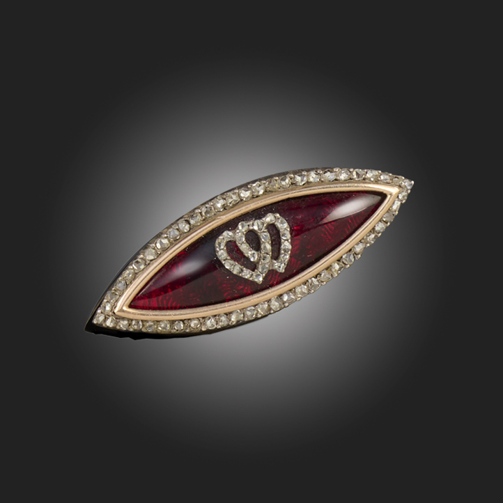 A GEORGE III DIAMOND BROOCH, of marquise shape, centred with a diamond-set interlocking heart motif against a red glass ground, within a border of rose-cut diamonds, the reverse with an erased inscription, mounted in gold, width 4cm, gross weight 5.9g, case