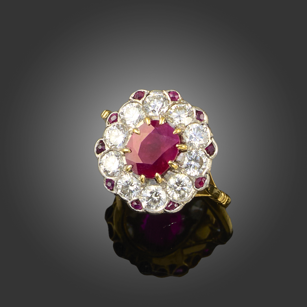 A RUBY AND DIAMOND CLUSTER RING, the cushion-shaped ruby set within a surround of round brilliant-cut diamonds and ruby accents in platinum and gold, size P
