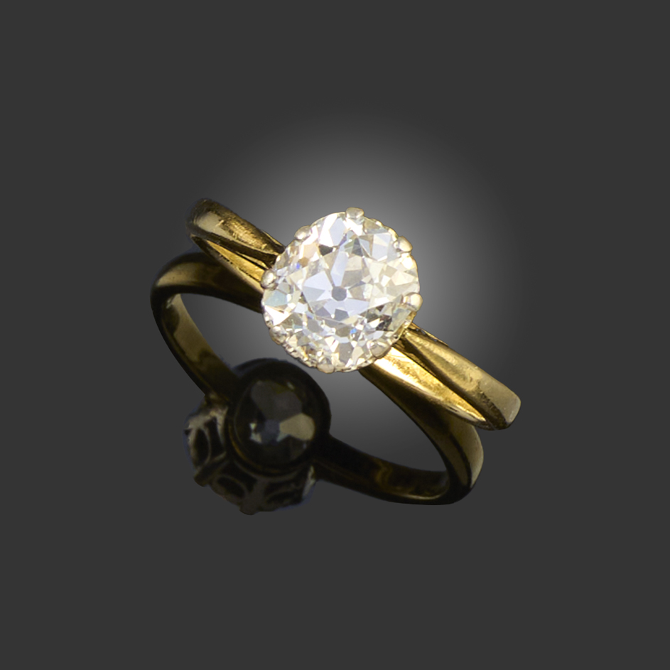 A DIAMOND SOLITAIRE RING, set with an old cushion-cut diamond weighing approximately 2.50cts, in 18ct yellow gold, maker's mark CPM, Birmingham hallmarks and stamped 750, size P