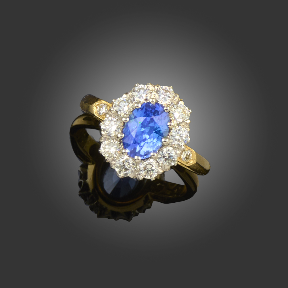 A SAPPHIRE AND DIAMOND CLUSTER RING