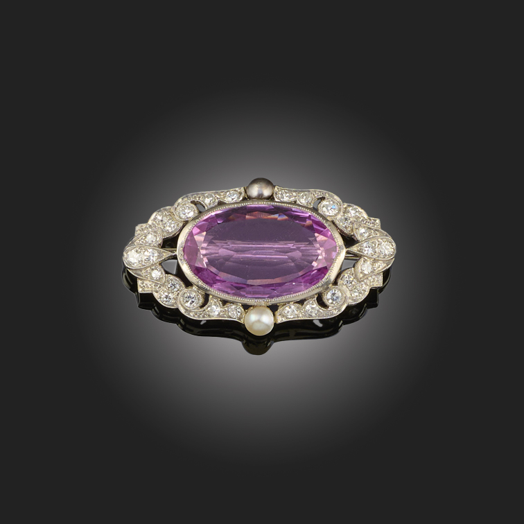 A PINK TOPAZ AND DIAMOND BROOCH, the oval topaz set within scrolling diamond surround accented with a black and white pearl, Austrian marks for 14ct, pearls untested, length 3.2cm