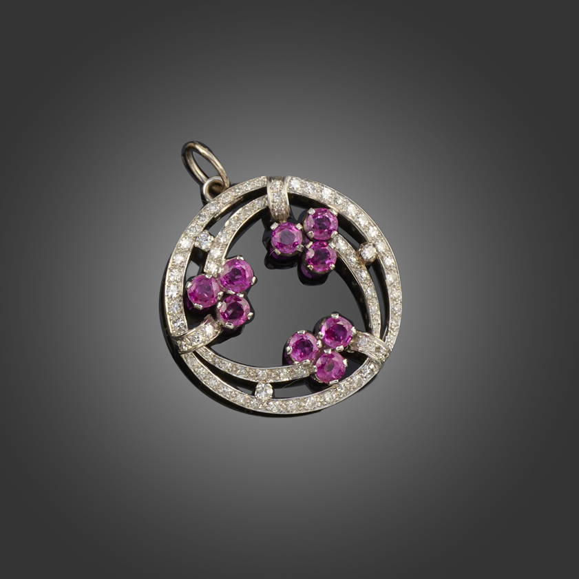 A RUBY AND DIAMOND PENDANT, of circular openwork design, set with single-cut diamonds and clusters of circular-cut rubies, in white gold, converted from a brooch, diameter 2.8cm, gross weight 6g