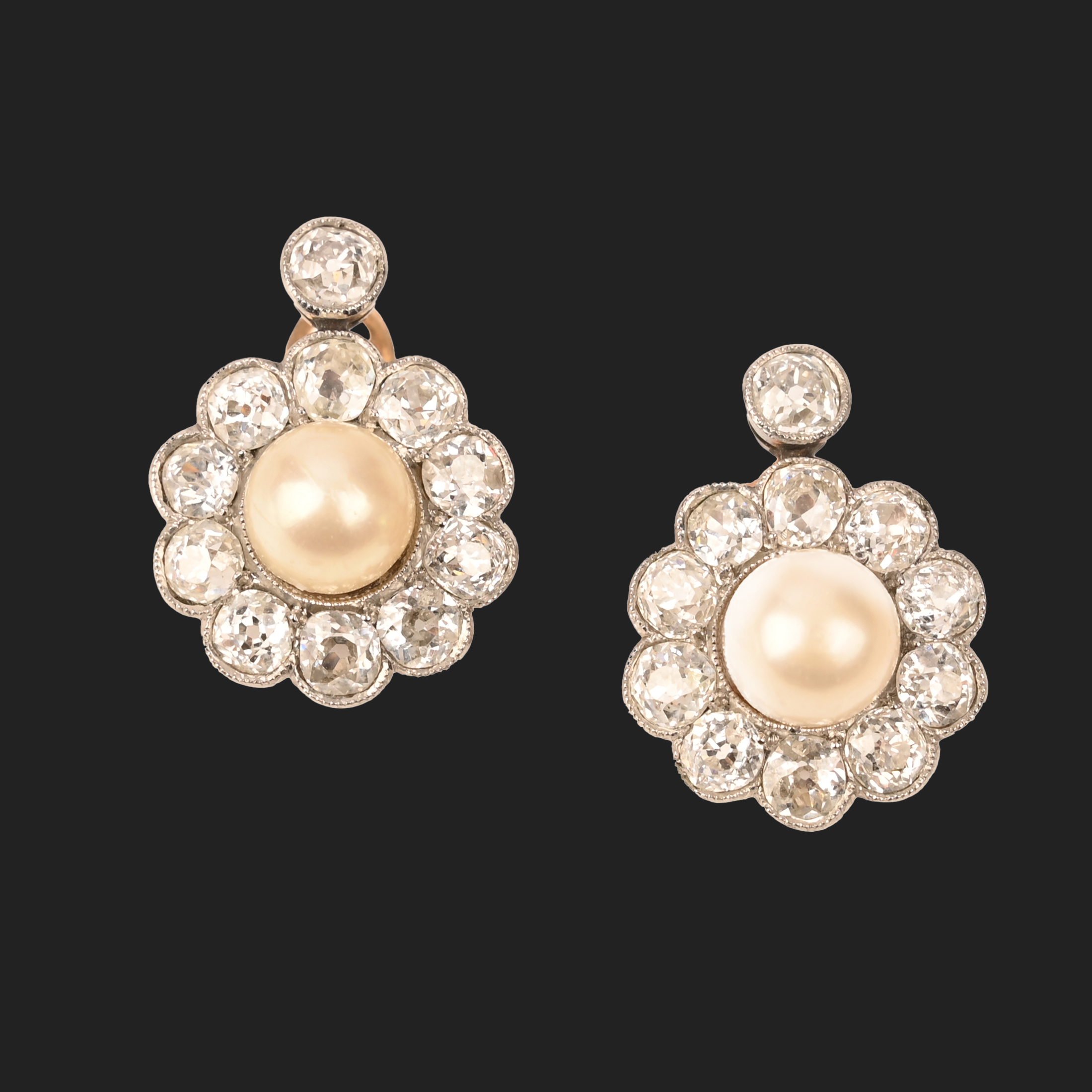 A PAIR OF NATURAL PEARL AND DIAMOND DROP EARRINGS