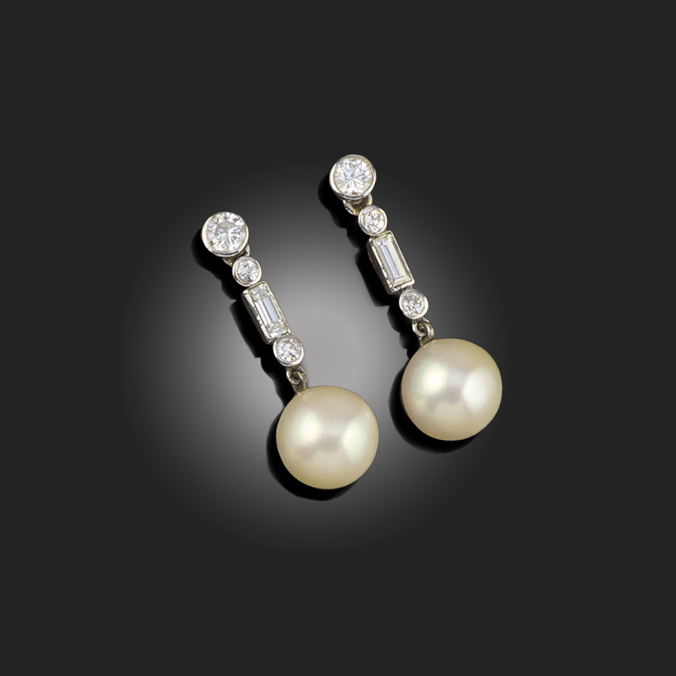 A PAIR OF NATURAL PEARL AND DIAMOND DROP EARRINGS