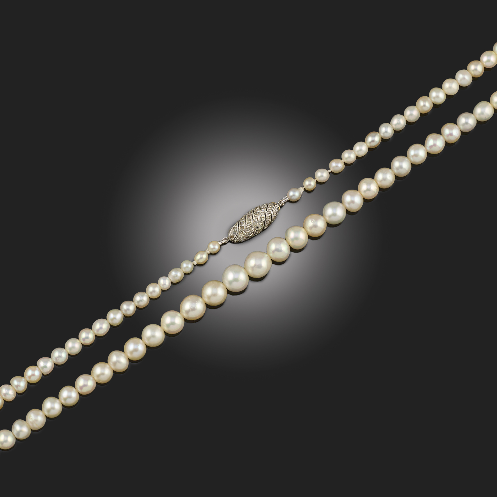 A SINGLE ROW NATURAL PEARL NECKLACE, the pearls graduate from 3.4 to 7.9mm on an oval diamond-set clasp, length 44cm
