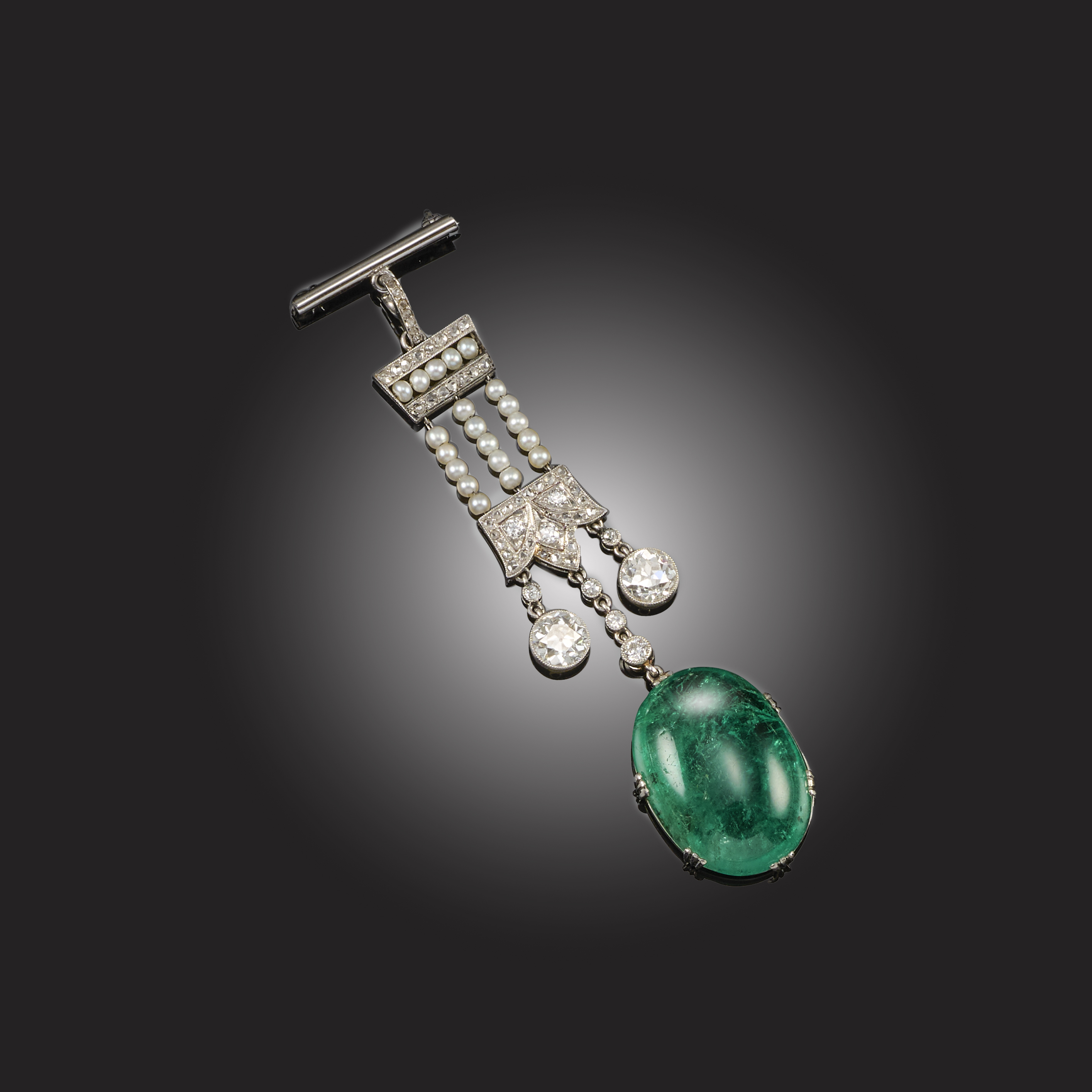 AN EARLY 20TH CENTURY EMERALD, DIAMOND AND SEED PEARL BROOCH PENDANT, set with a seed pearl and diamond plaque suspending articulated lines of seed pearls and a diamond-set fleur-de-lys plaque which suspends two old-cut diamond pendants and a central emerald cabochon, the emerald weighing approximately 26.00cts, the two principal diamonds weighing approximately 1.40cts in total, length 8cm, case