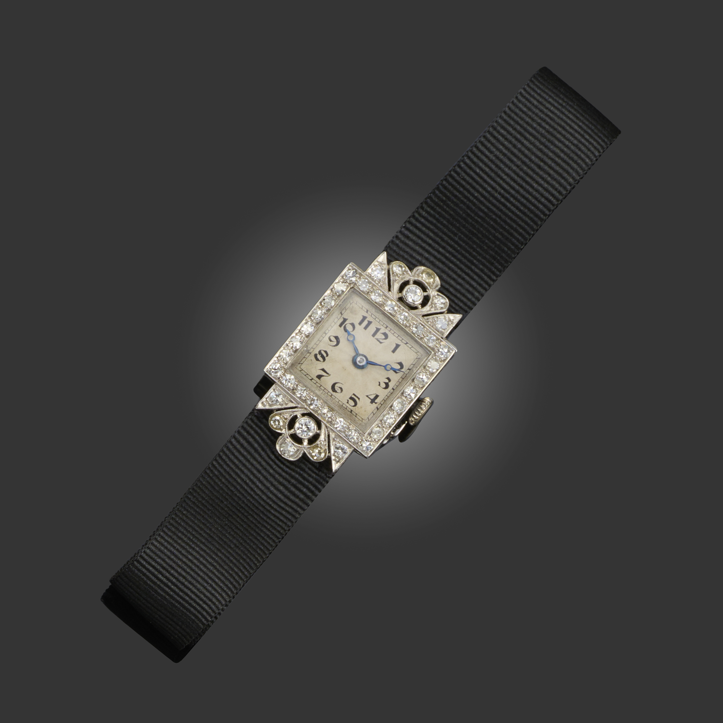 ROLEX, A LADY'S ART DECO DIAMOND COCKTAIL WATCH, the square silvered dial with black Arabic numerals, outer minute marker and blued steel hands, the bezel with milligrain-set circular-cut diamonds in platinum, to a fabric strap with a white gold clasp, manual winding, movement signed Rolex, case numbered 3755 and stamped All Platinum, clasp stamped 9ct, case width 1.8cm