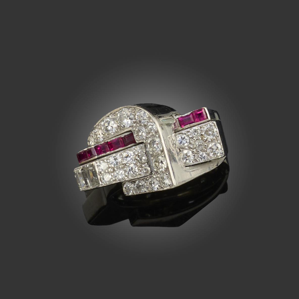 AN ODEONESQUE RUBY AND DIAMOND RING, set with circular-cut and baguette-shaped diamonds with ruby accents in platinum, size O