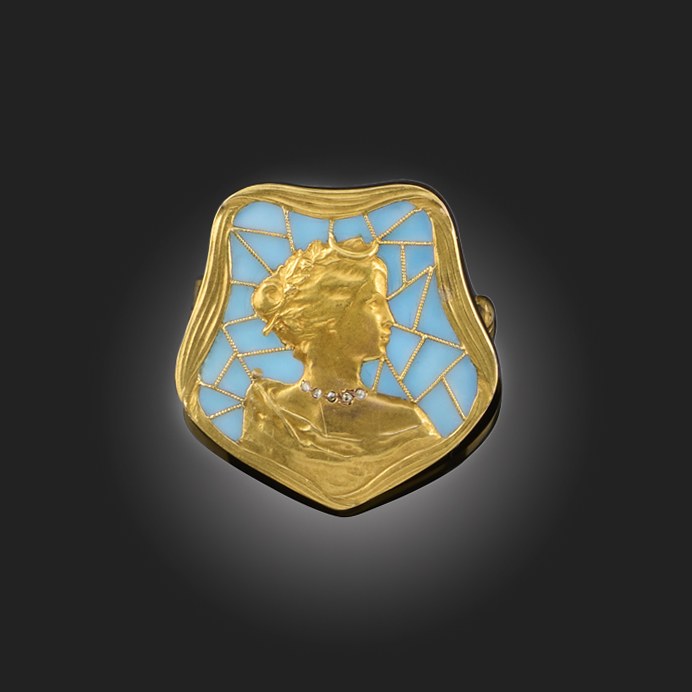 AN ART NOUVEAU GOLD BROOCH, depicting Selene wearing a diamond necklace against blue plique-à-jour background within striated gold border in yellow gold, length 2.7cm
