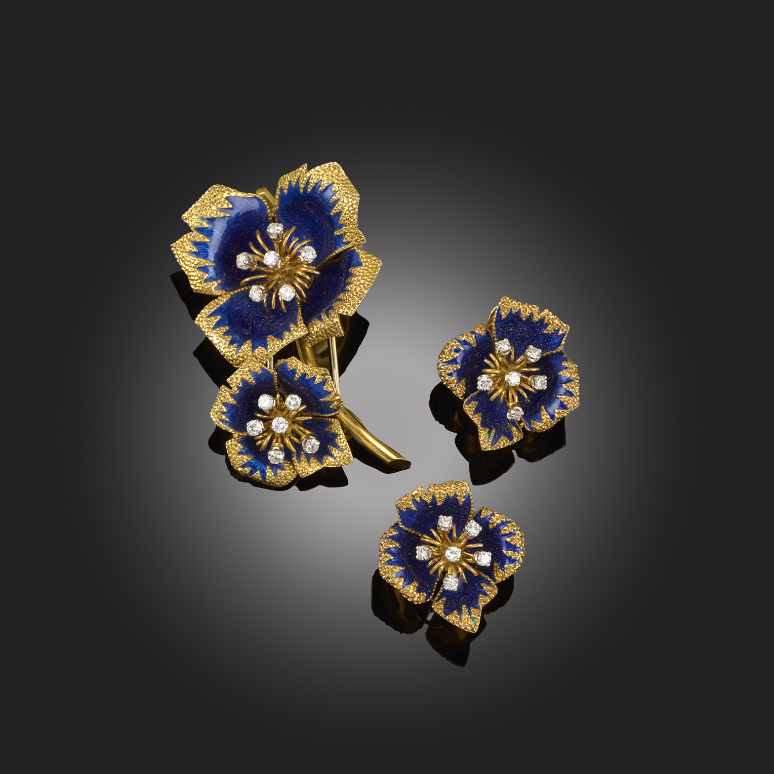CARTIER, AN ENAMEL AND DIAMOND DEMI PARURE, C1960, comprising a stylised flower brooch decorated with blue enamel leaves with textured gold borders and diamond stamens in 18ct yellow gold, signed Cartier and numbered 019041, with French control marks and rubbed maker's lozenge for Société Georges Richards, length 5.5cm, 30g, with a matching pair of earrings, signed Cartier and numbered 03998, with French control marks and makers lozenge for Société Georges Richards, clip fittings, length 2.5cm, 22g