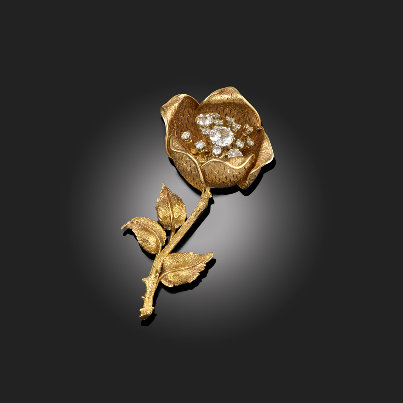 A FINE DIAMOND AND GOLD BROOCH, DESIGNED AS A WILD ROSE