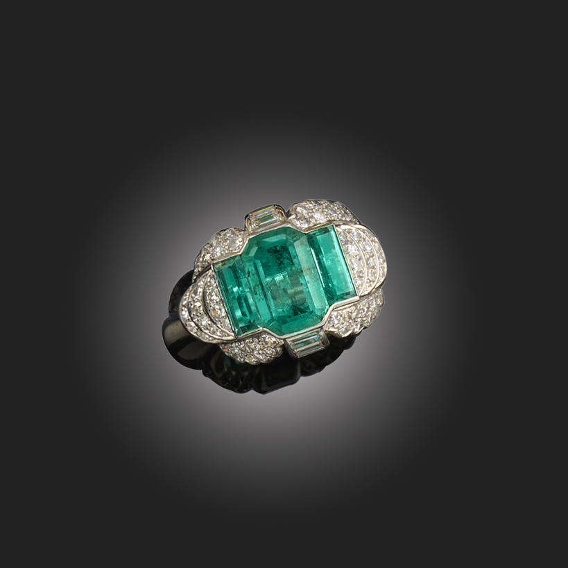 AN EMERALD AND DIAMOND BOMBÉ RING