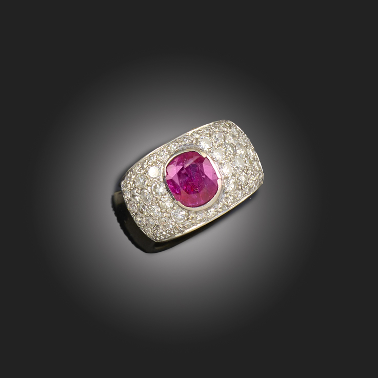 A RUBY AND DIAMOND BOMBÉ RING