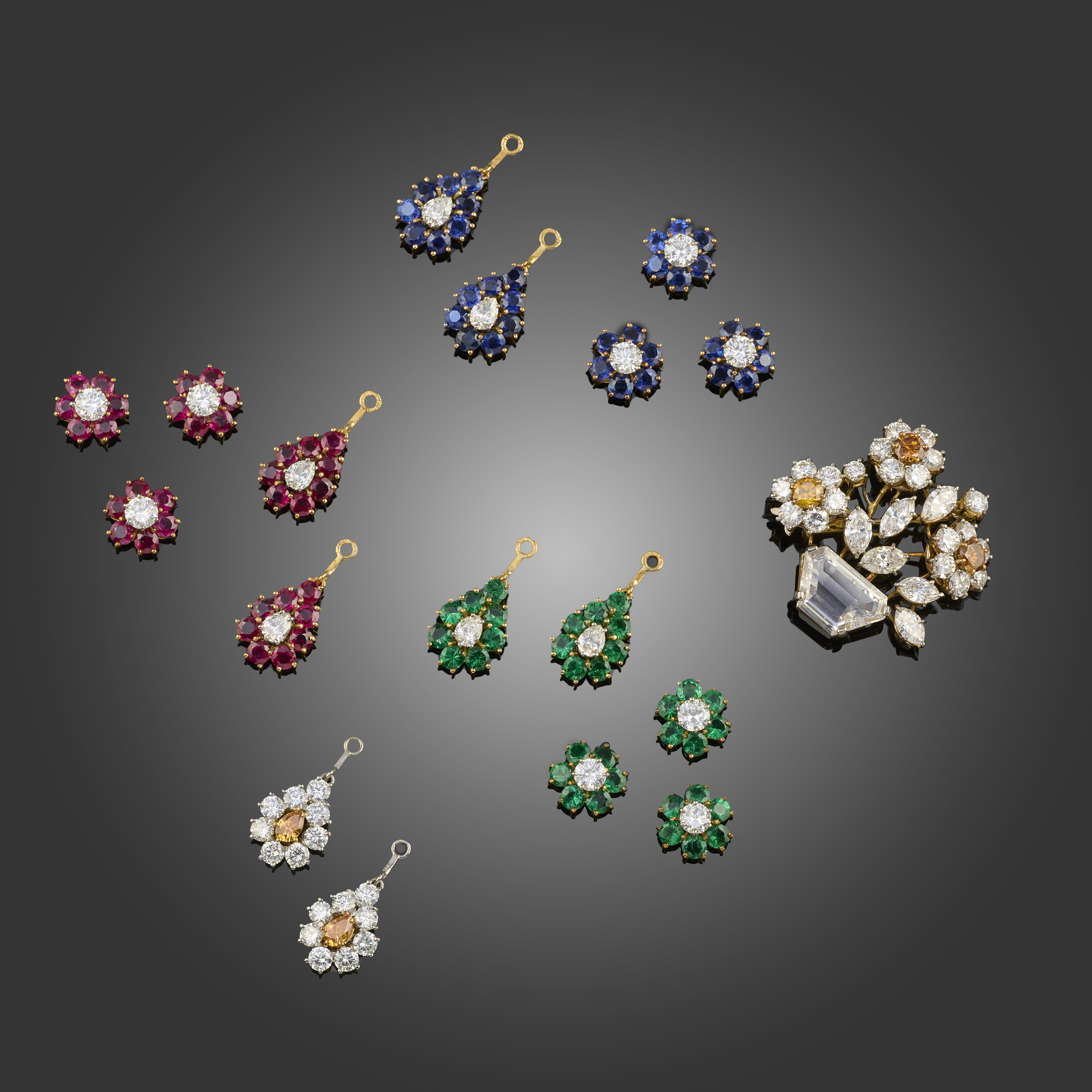 A DIAMOND-SET GIARDINETTO BROOCH, CONVERTIBLE TO EARRINGS, comprising: a brooch mount designed as a stylised vase of flowers, set with a hexagonal diamond below five marquise-shaped diamonds, the three mounts supporting interchangeable clusters, composed of brown/orange and white diamonds, sapphires and diamonds, rubies and diamonds, and emeralds and diamonds, with further ear stud mounts, all in gold, ear studs indistinctly marked, brooch length 3cm, ear stud width 1.2cm, fitted case; together with removal pendants of 'Day & Night' design, each composed of a drop-shaped cluster, set respectively with brown/orange and white diamonds, sapphires and diamonds, rubies and diamonds, and emeralds and diamonds, mounted in gold, stamped 750 and indistinctly marked, length 2.2cm, fitted case