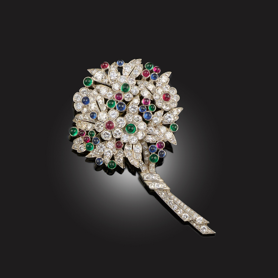LACLOCHE FRÈRES, AN ART DECO BROOCH, designed as a bouquet of flowers set with cabochon rubies emeralds and sapphires amongst diamond-set flowers in platinum, signed Lacloche Frères and numbered 2005, with French control marks, length 6cm, case