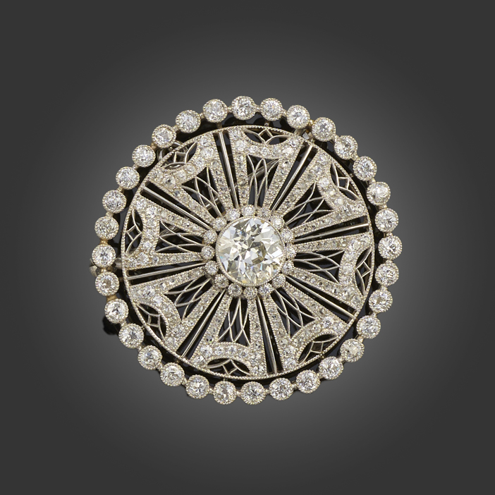 A BELLE EPOQUE DIAMOND BROOCH / PENDANT, set to the centre with an old circular-cut diamond weighing approximately 1.45cts, within a pierced open-work frame millegrain-set with rose-cut diamonds and a further border of old circular-cut diamonds in platinum, folding bail to the reverse, diameter 3.6cm