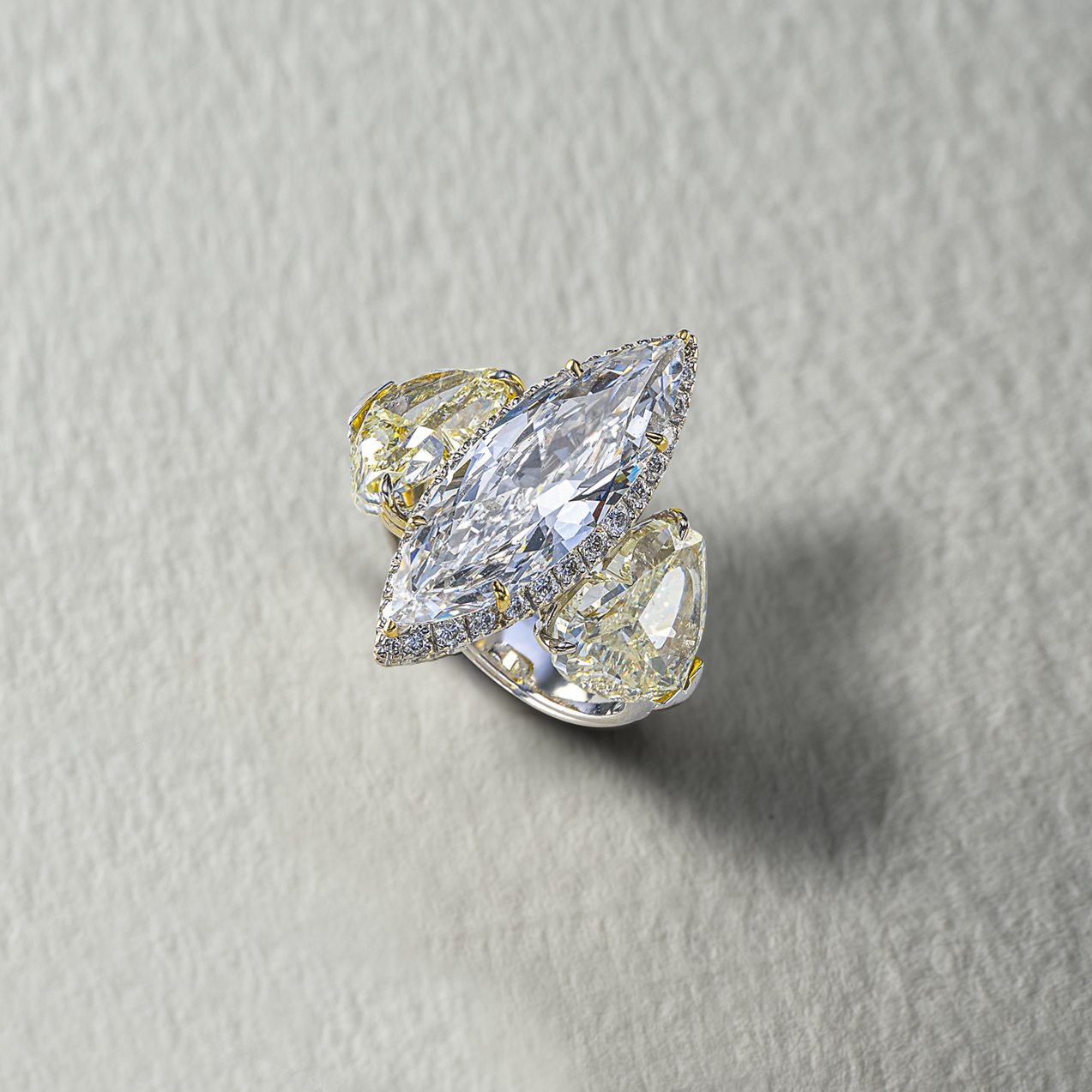 AN IMPRESSIVE DIAMOND THREE STONE RING, set with a marquise-shaped diamond to the centre weighing 3.68cts, within a round brilliant-cut diamond-set surround, flanked with heart-shaped yellow diamond shoulders, in white and yellow gold, the heart shaped diamonds weighing approximately 2.00 and 1.90cts, size L