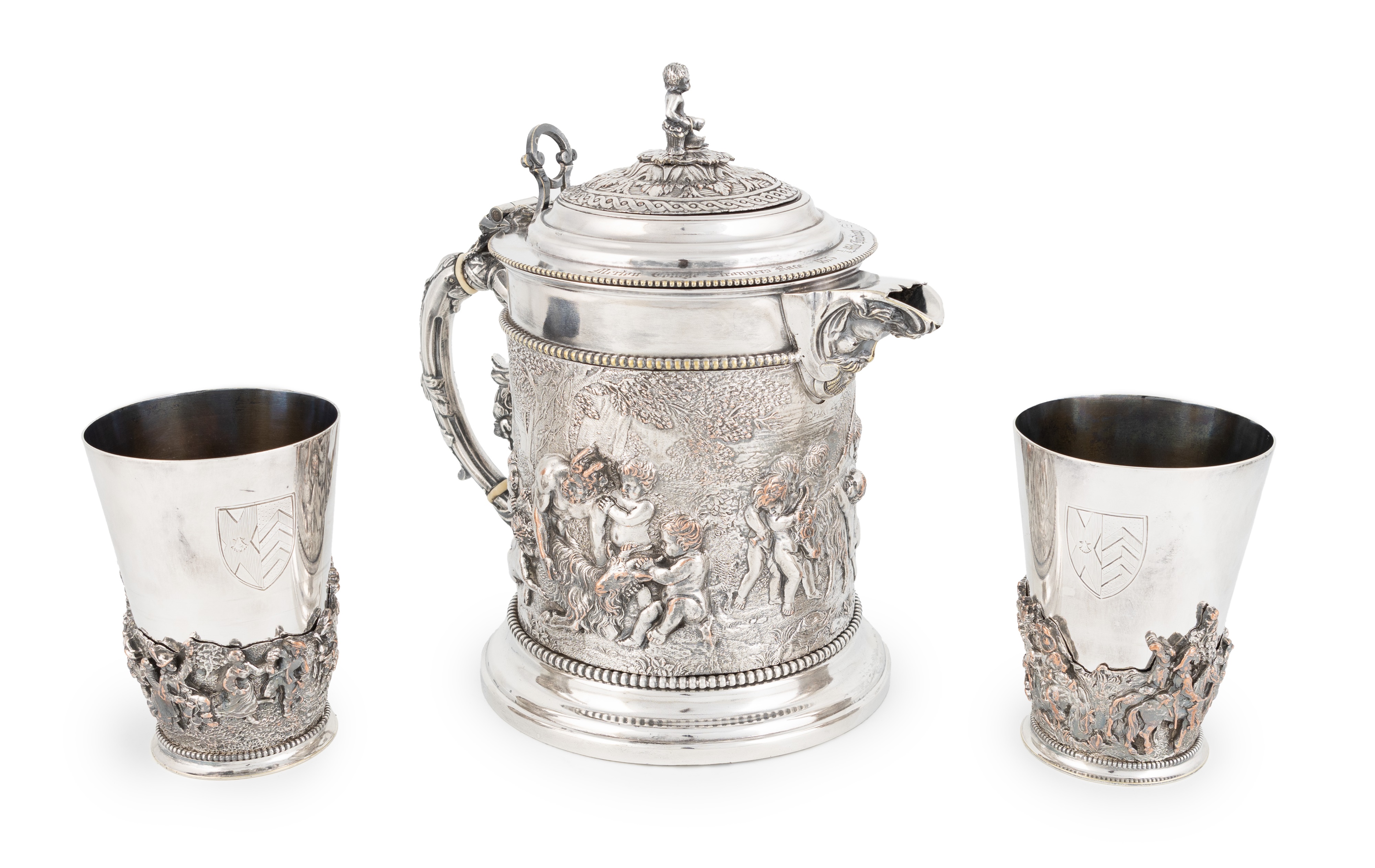circular form with a relief scene of putto around rams and a reclining Bacchus, acanthus leaf capped scroll handle with ivory insulators, the cover inscribed 'Merton College Strangers Race 1873 1/4 mile handicap G.F.Power' with a putti finial, height 23cm, the beakers of circular tapering form with relief rural scenes with figures dancing, engraved with crests. (3)