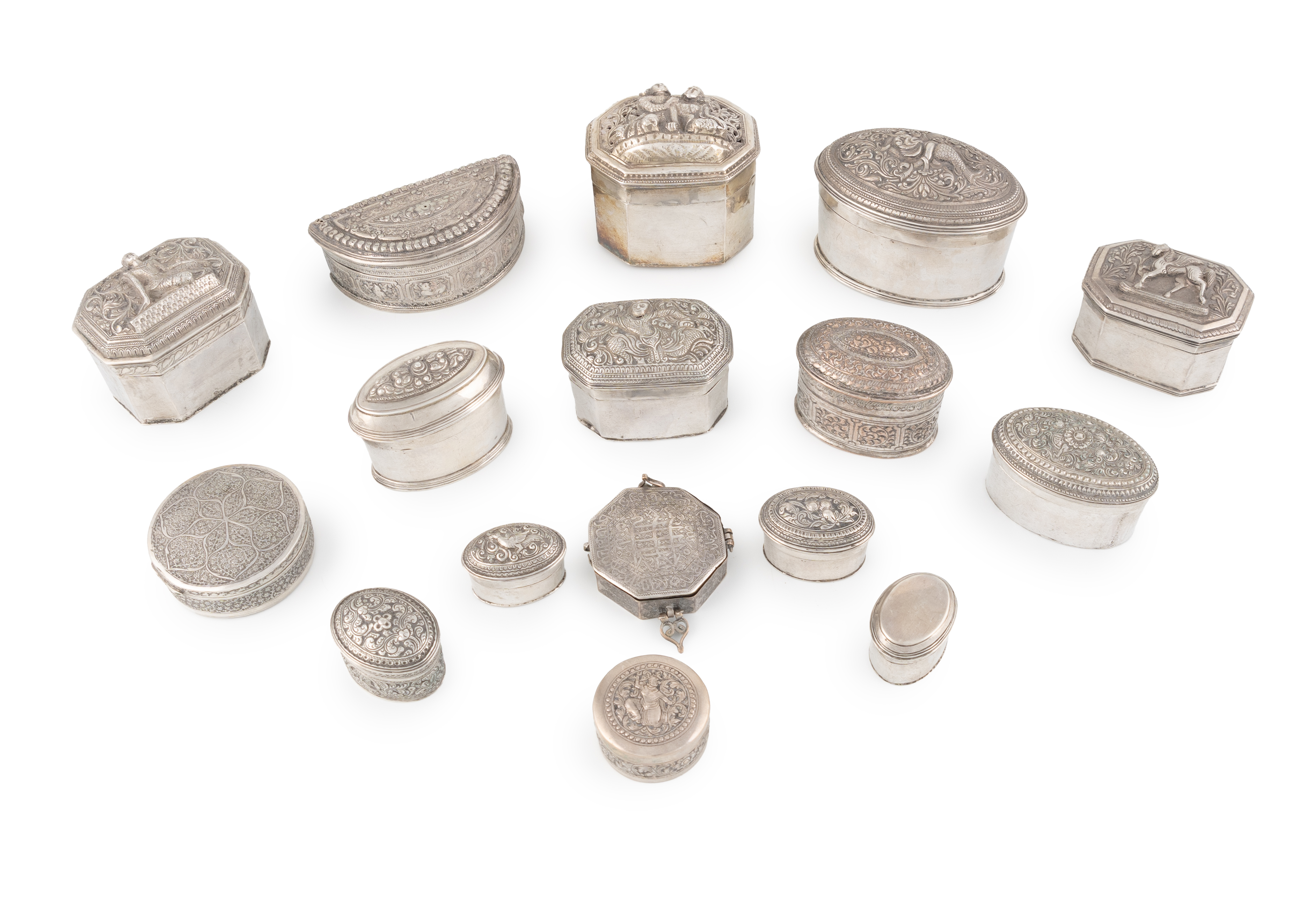 comprising: four of rectangular form with canted corners and the covers embossed with deities, eight of oval form with scroll foliate decoration and four other boxes. (16)
